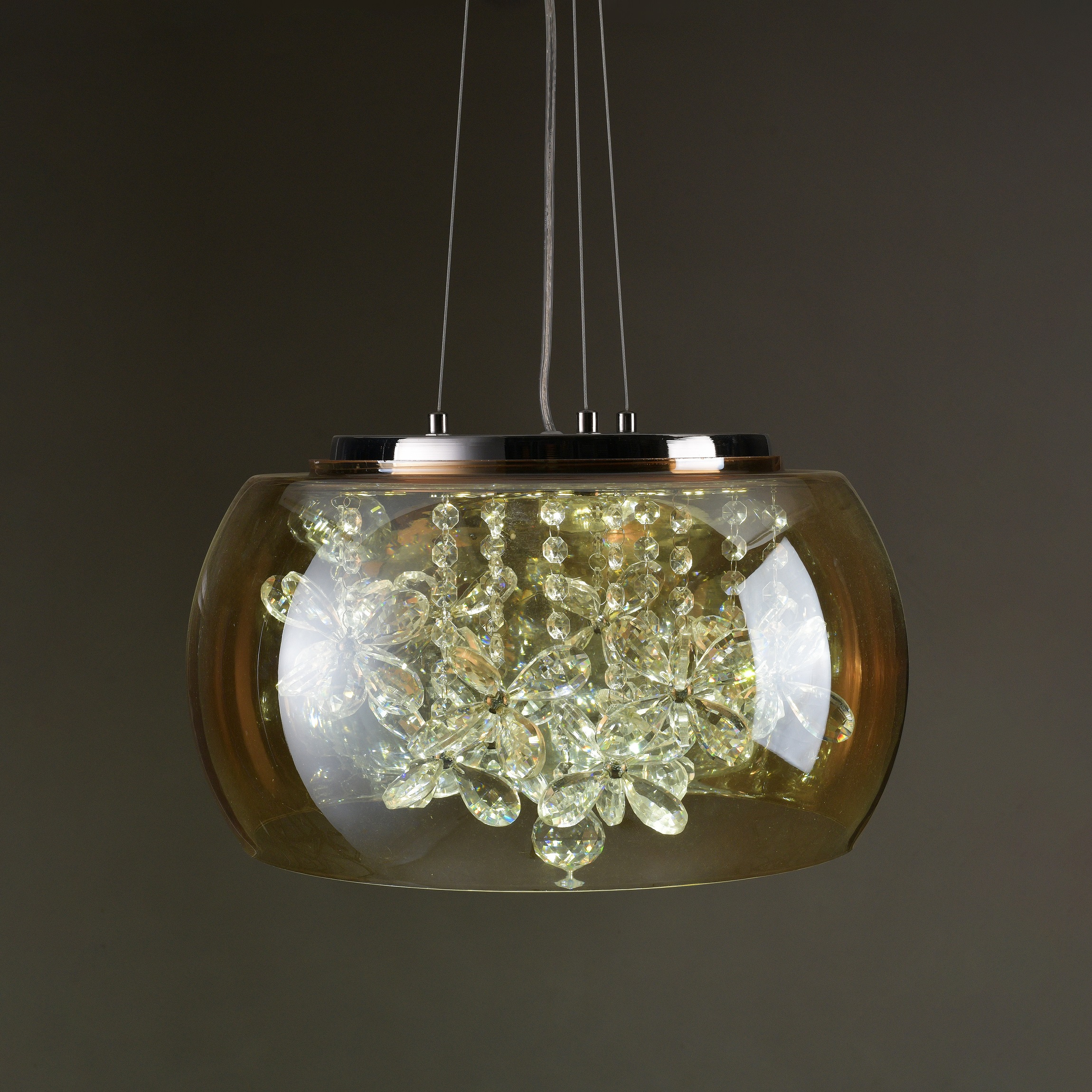 Add a warm, luxurious glow to your decor with this Amber Glass Chandelier With Crystals. The rich amber glass creates an inviting ambience, while the crystal accents add sparkle and elegance. A perfect decorative centerpiece that enhances your space with a premium, stylish touch.