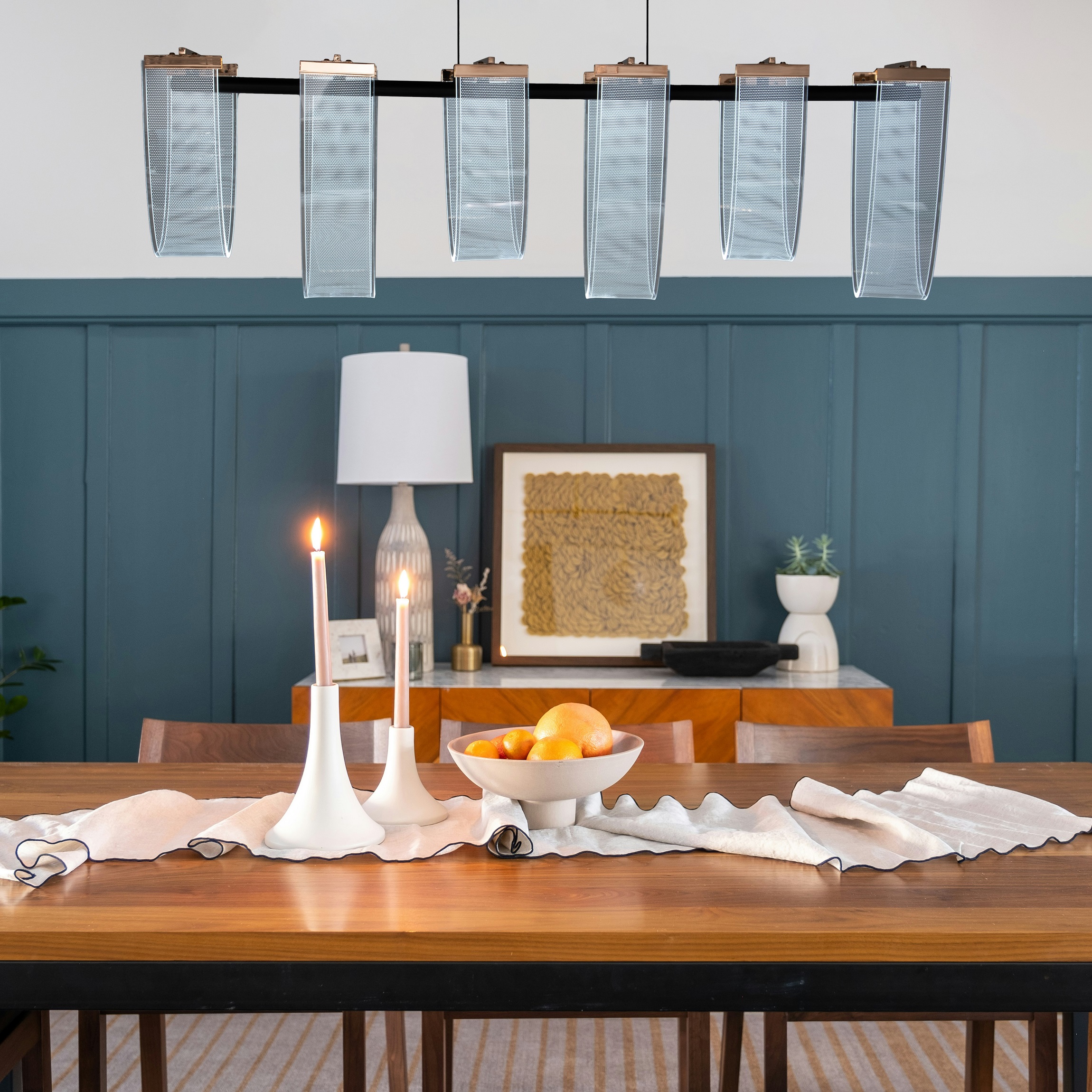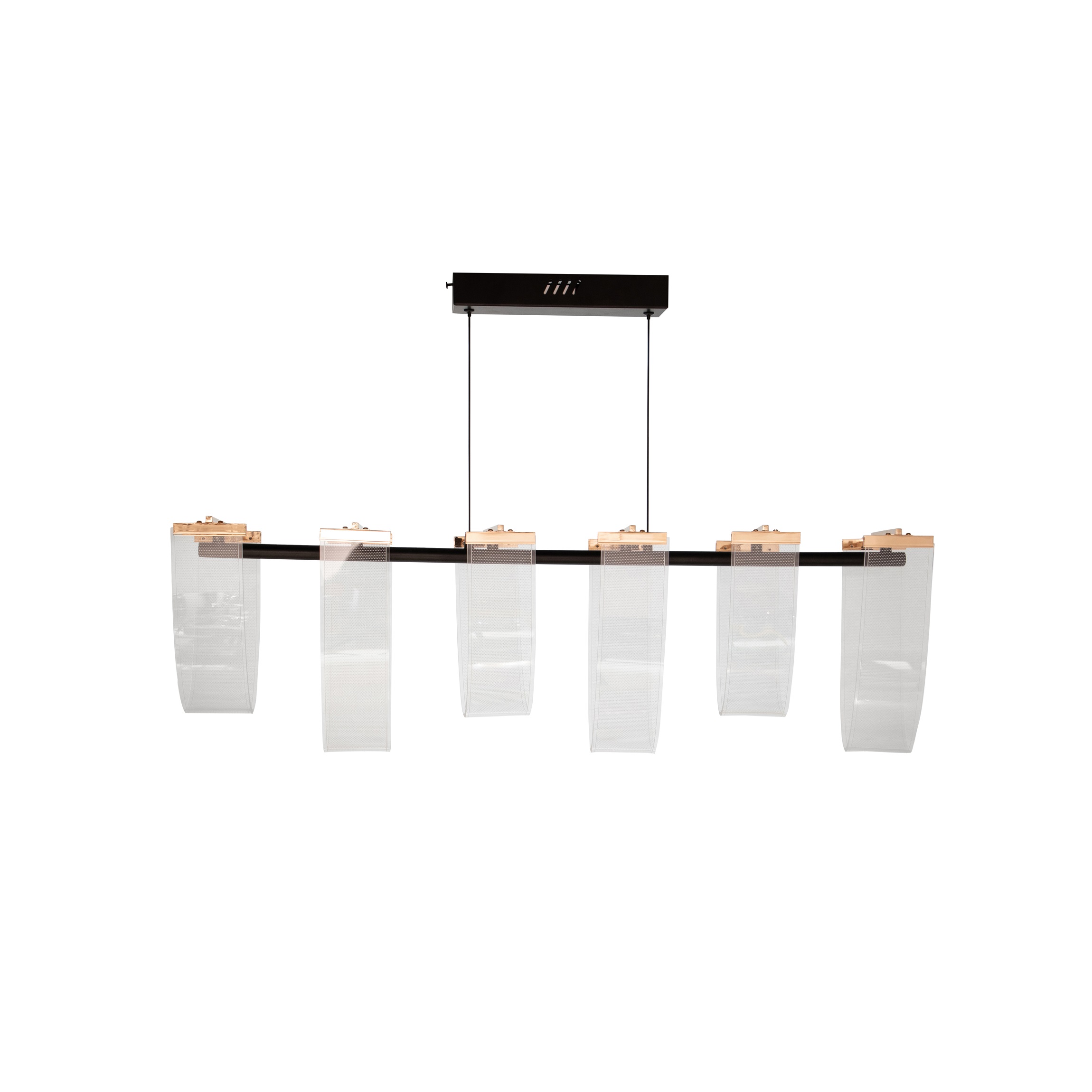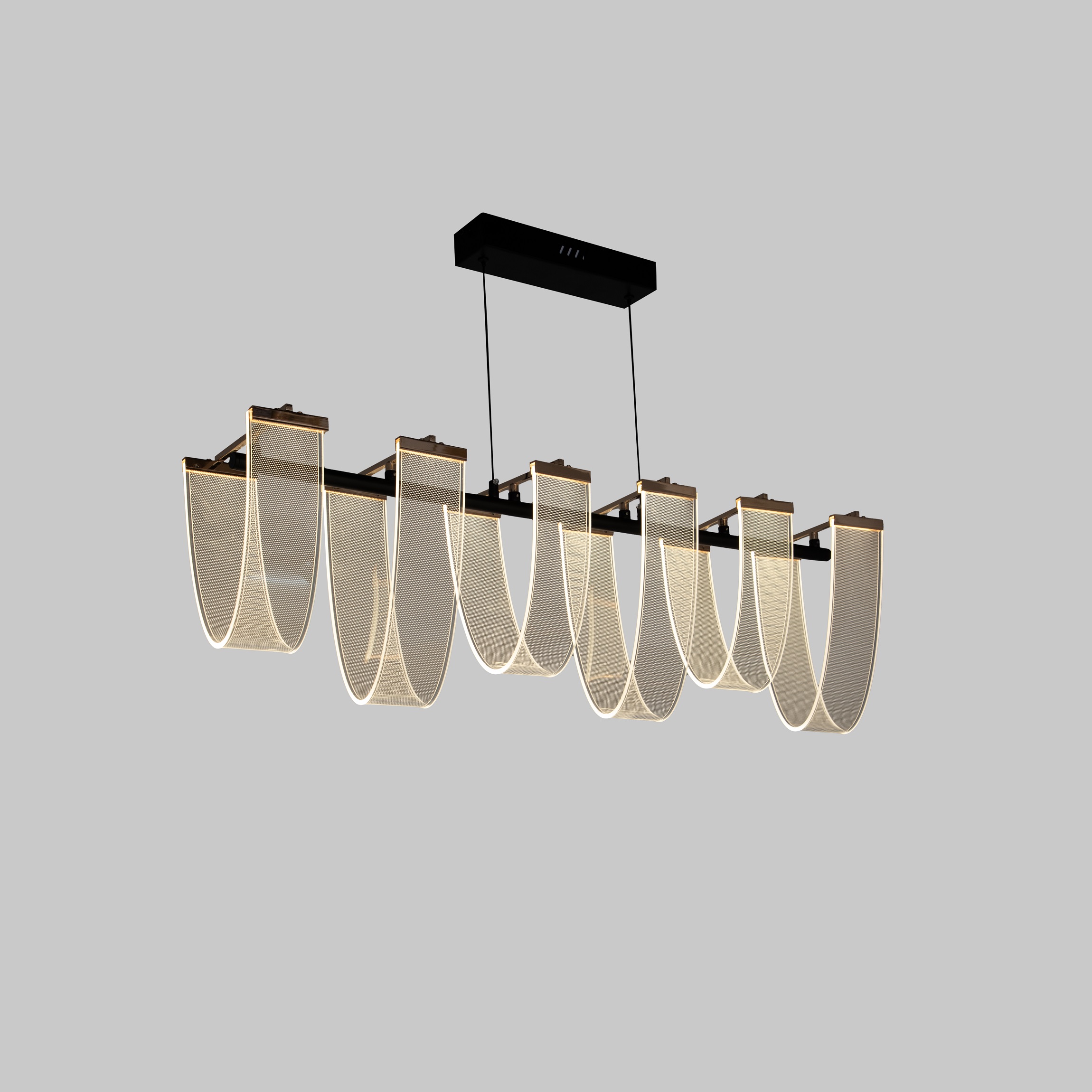 The Arcline Drift Acrylic Chandelier brings a sleek, contemporary aesthetic to any space with its elegant linear form and beautifully curved acrylic panels. Designed to diffuse light softly and evenly, the high-clarity acrylic shades create a smooth, flowing appearance that enhances the chandeliers modern architectural appeal. Suspended from slim wires and finished with rose-gold accents atop a clean black bar, this fixture blends minimalism with refined luxury.