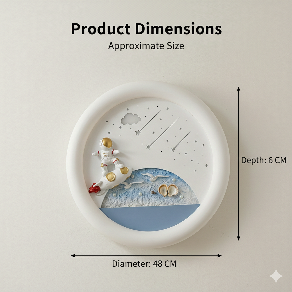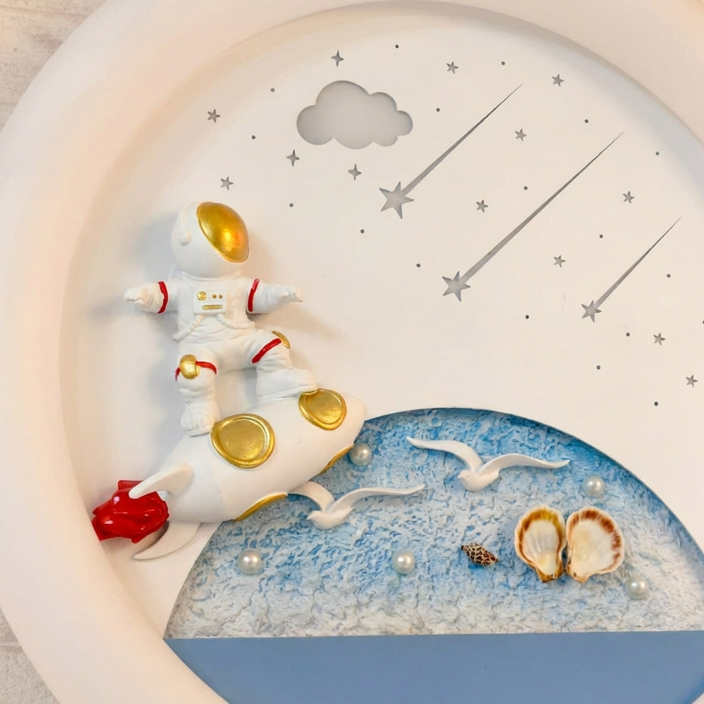 Turn your child’s space into a dreamy galaxy with the Proudome Astro Voyage Kids Wall Light. Featuring a charming astronaut riding a rocket above a textured planet landscape, this round decorative wall lamp brings imagination and adventure to modern interiors.