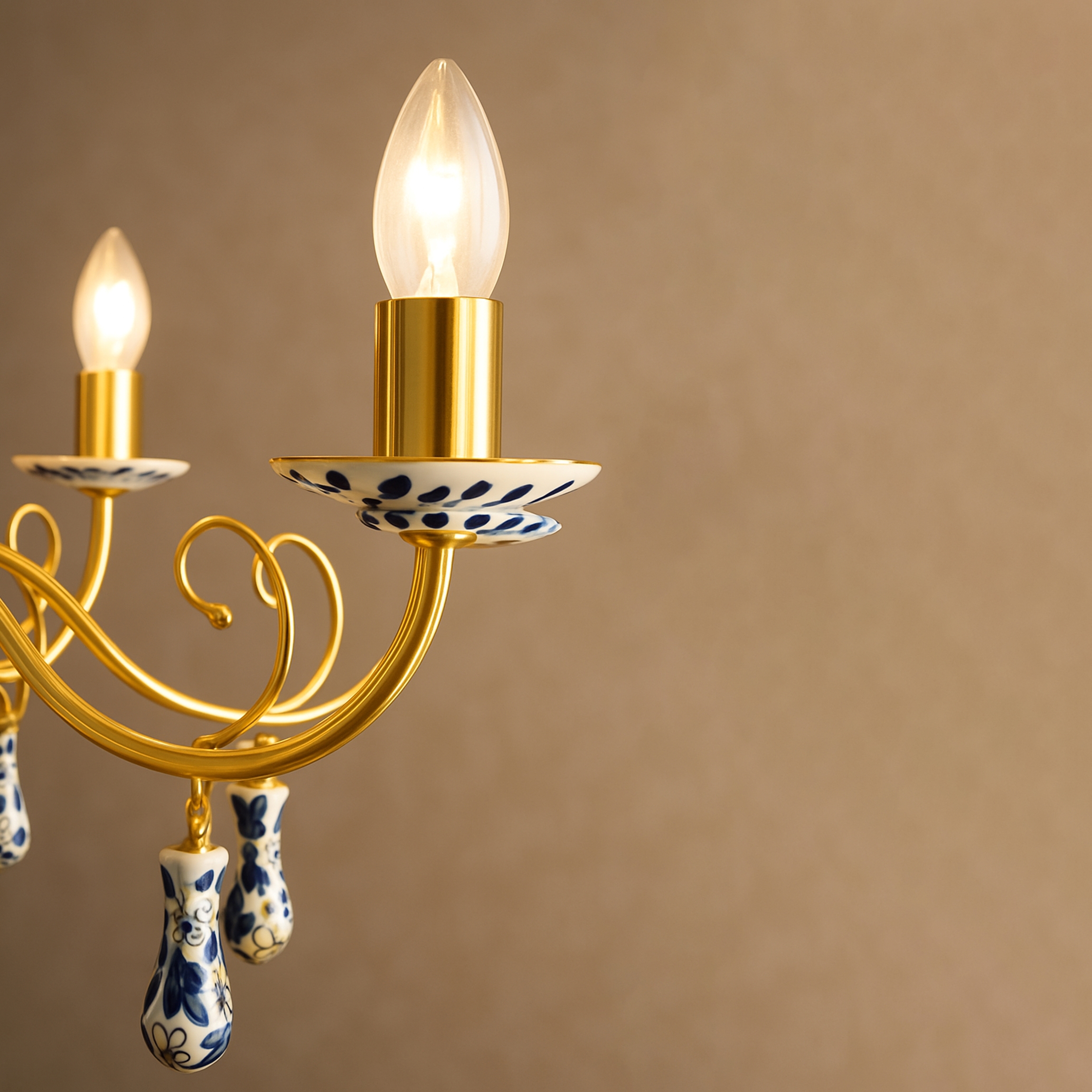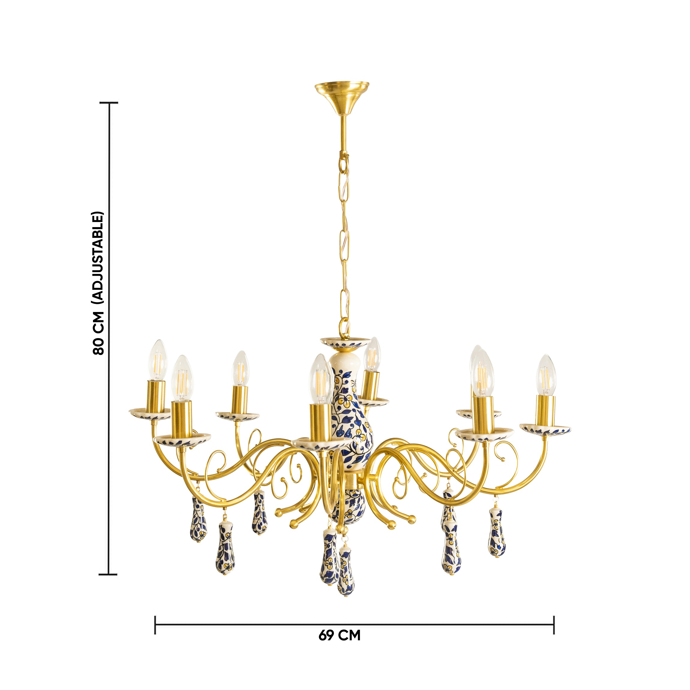 Bring a touch of timeless sophistication to your interiors with the Aurelia Crown 8-Light Chandelier, a centerpiece crafted for modern luxury spaces. Its beautifully sculpted frame, finished in a radiant gold tone, is paired with intricate handcrafted porcelain ornaments, adding a refined artistic character that elevates any room.