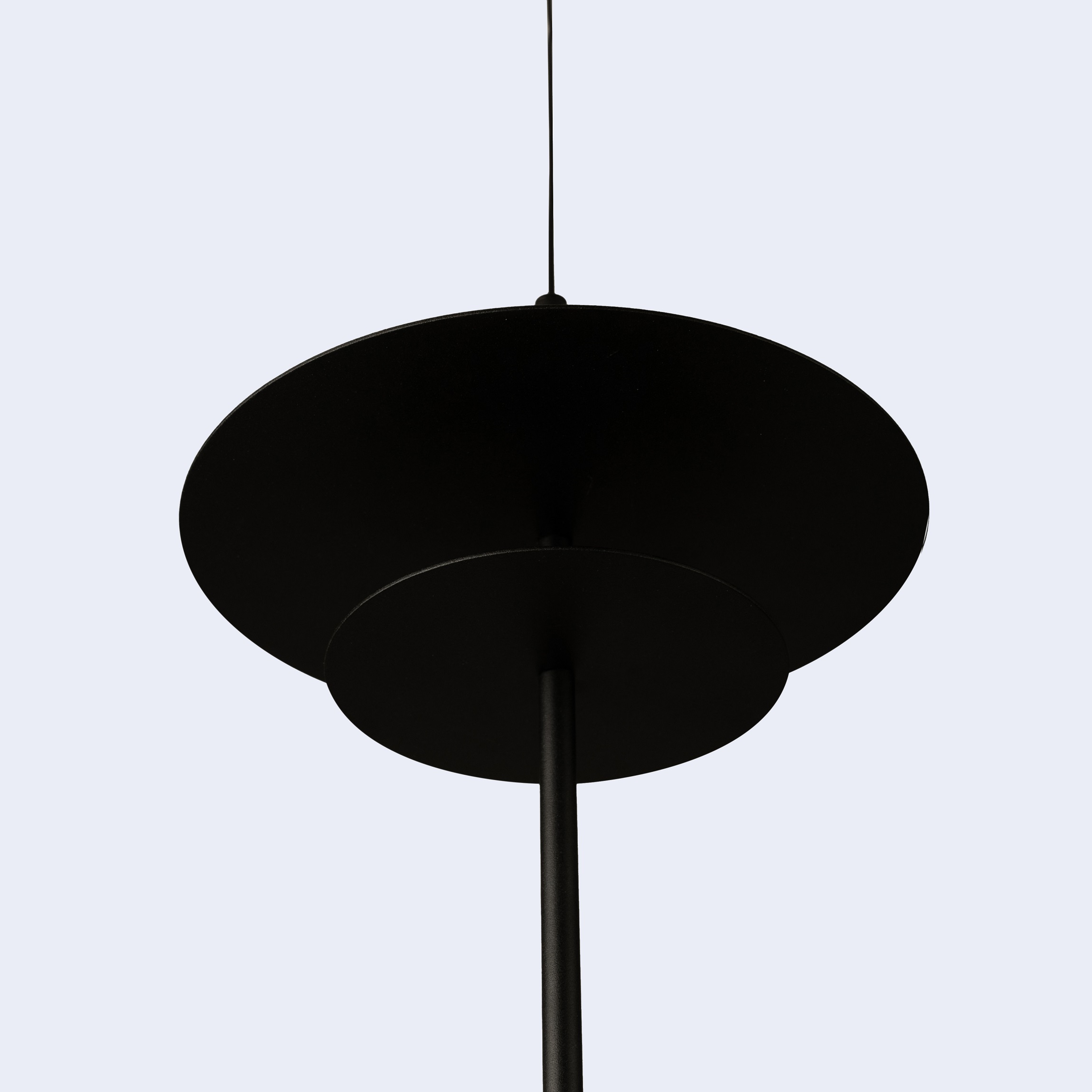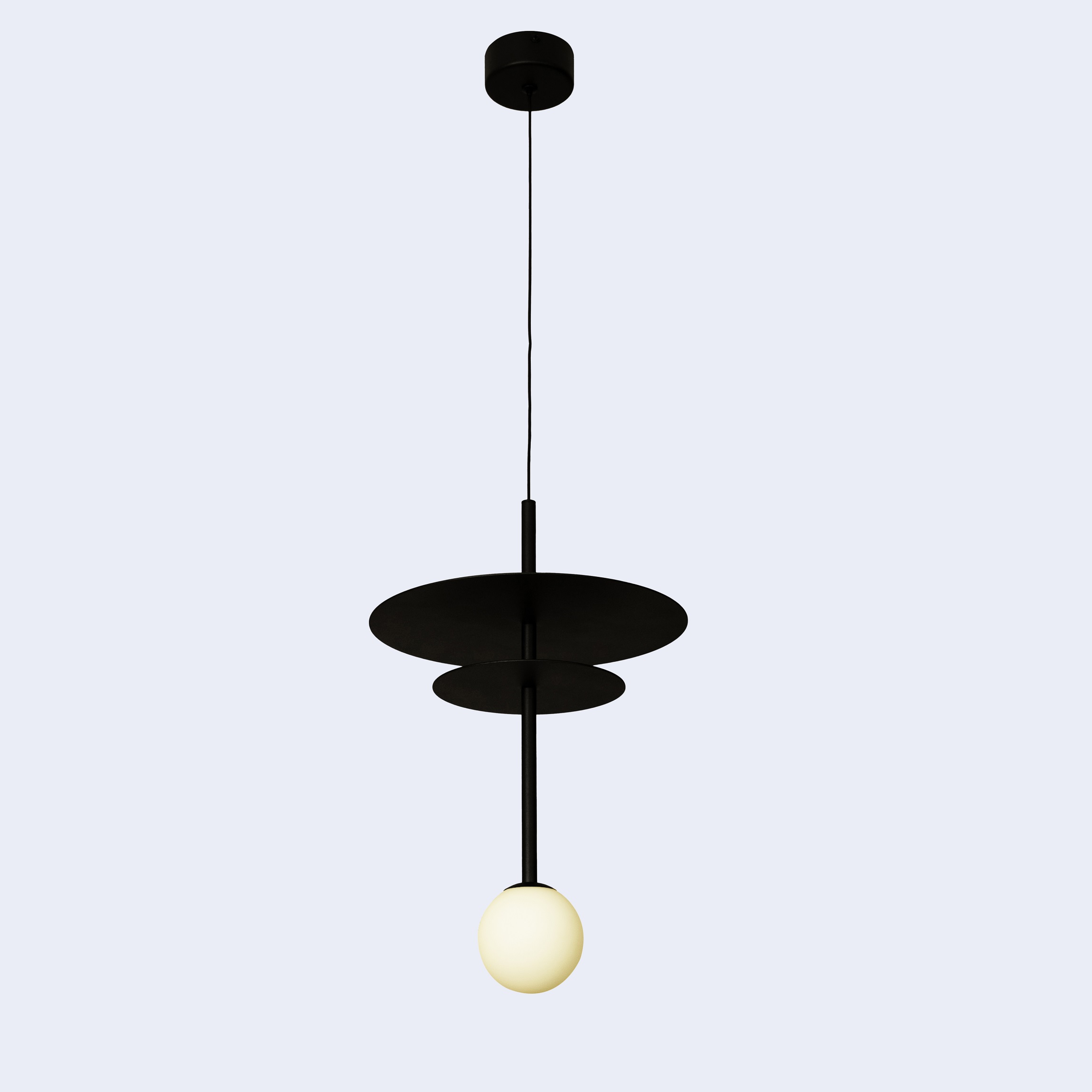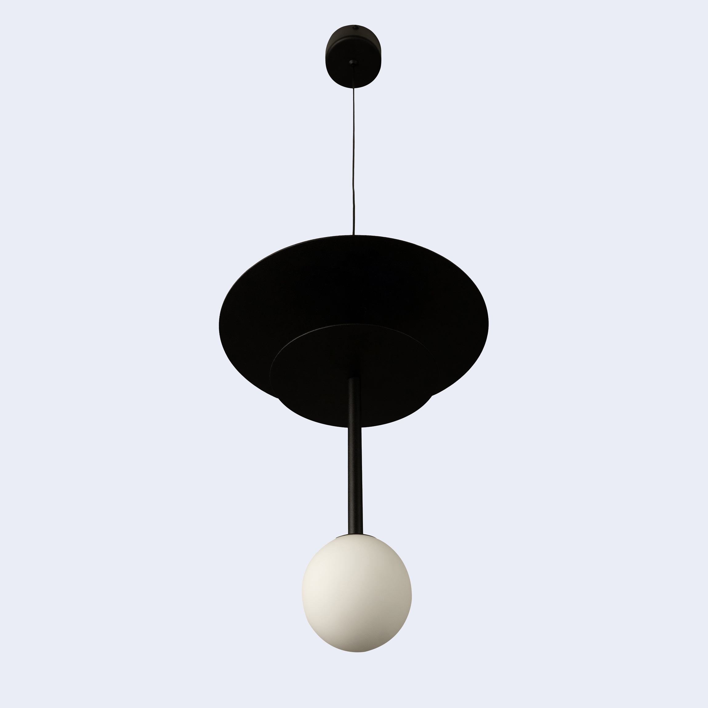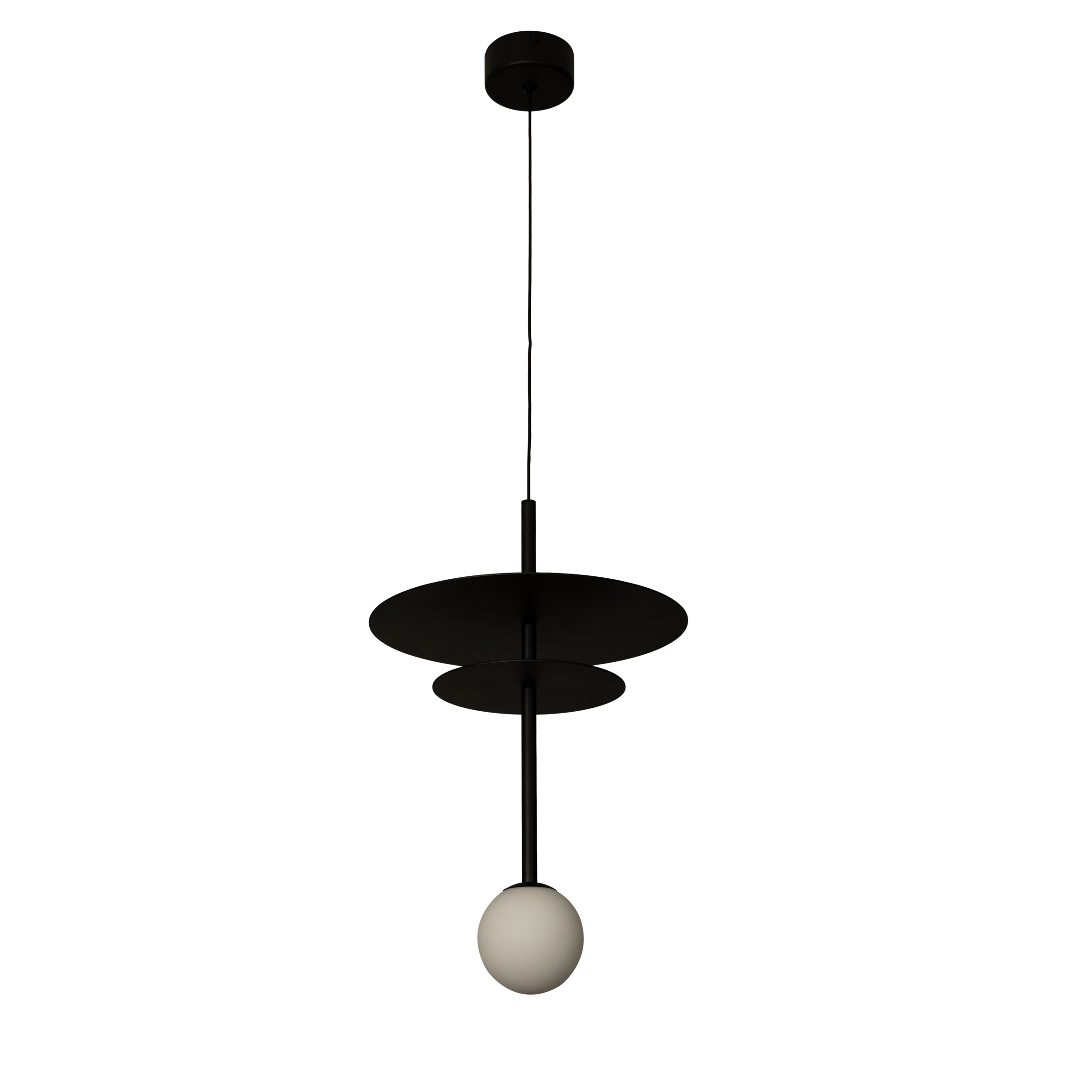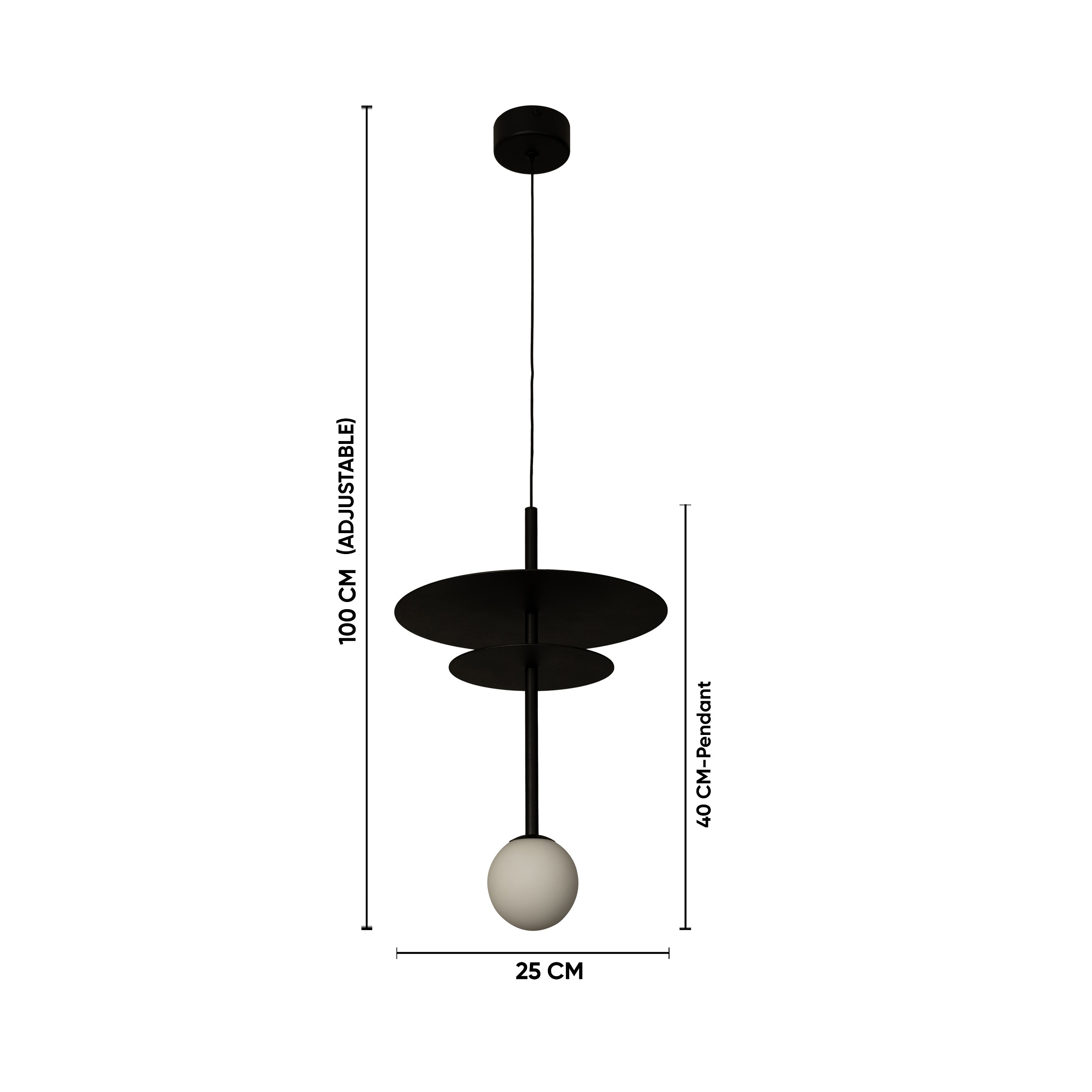 The Eclipse Halo Pendant Light features a striking layered disc design finished in matte black, paired with a soft opal glass globe that diffuses light evenly. The bold geometric form creates a sculptural statement while delivering a warm, balanced glow. Suspended neatly from the ceiling, this pendant adds a contemporary edge and artistic character to modern interiors, making it ideal as a focal lighting piece.