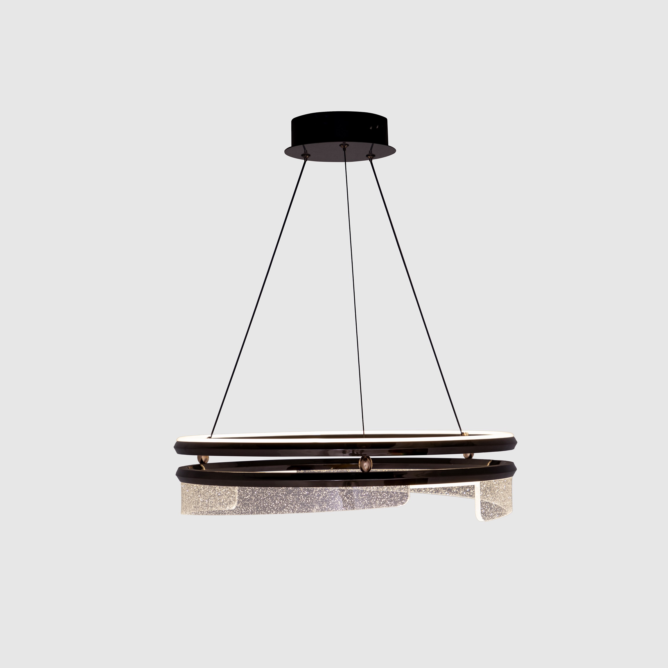 This Chandelier is a striking fusion of contemporary design and refined elegance. Inspired by orbital movement, its sculpted dual-ring structure creates a floating, futuristic aesthetic that enhances any modern interior. Each ring emits a soft, ambient glow that evenly illuminates your space while adding an artistic architectural touch.