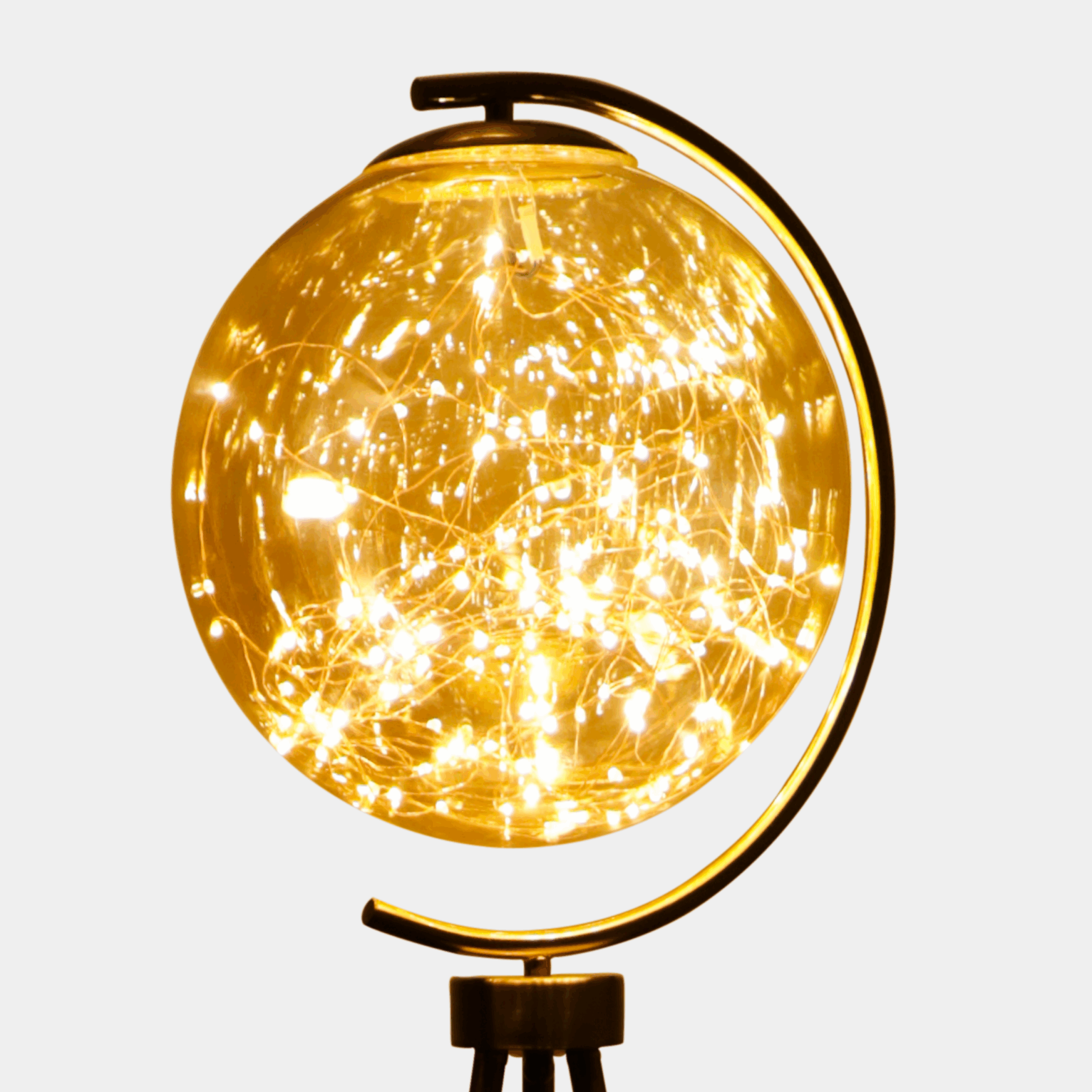 Utilise our tripod floor lamp to combine modern design with rustic appeal. Its sleek metal legs in gold finish and hanging glass ball with fairy light inside and exposed lights combine modern design with a rustic feel to make it a striking addition to any space.