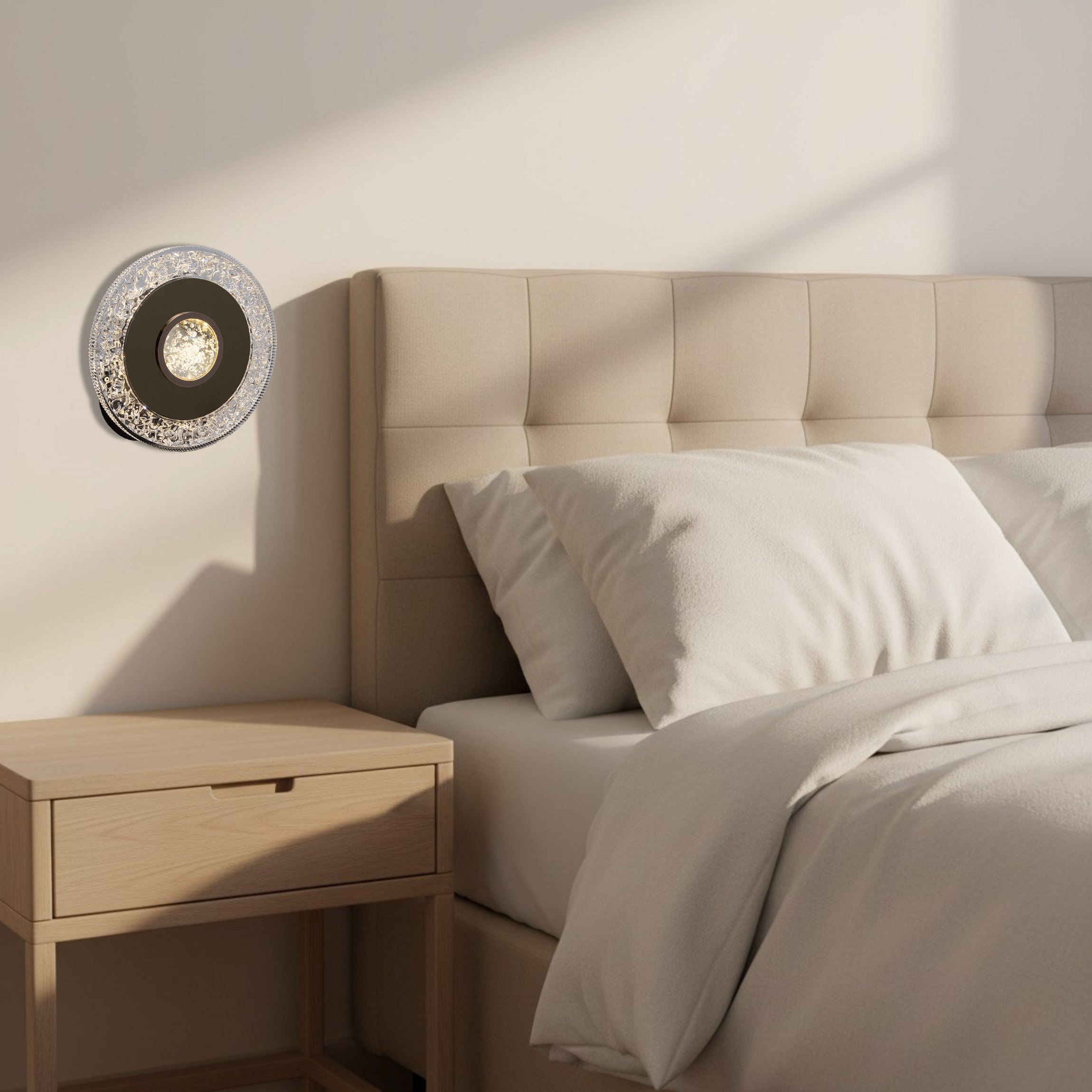 The Luna Ripple Bubble Wall Light is a perfect blend of modern design and artistic detail. Featuring a beautifully textured outer glass ring and a distinctive bubble-effect central lens, this wall light creates a soft, layered glow that adds depth and visual interest to any space. When illuminated, the ripple texture gently reflects light while the bubble center produces a subtle, eye-catching focal point. The contrast between the dark inner panel and the clear textured glass gives this piece a refined, contemporary look. Ideal for living rooms, bedrooms, hallways, dining areas, lounges, cafes, and premium interiors, this wall light works beautifully as an accent piece or in pairs for a balanced wall composition. Its elegant design enhances ambience without overpowering the decor.