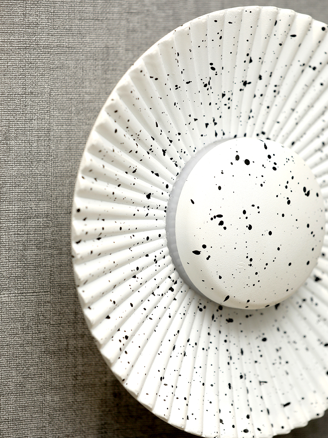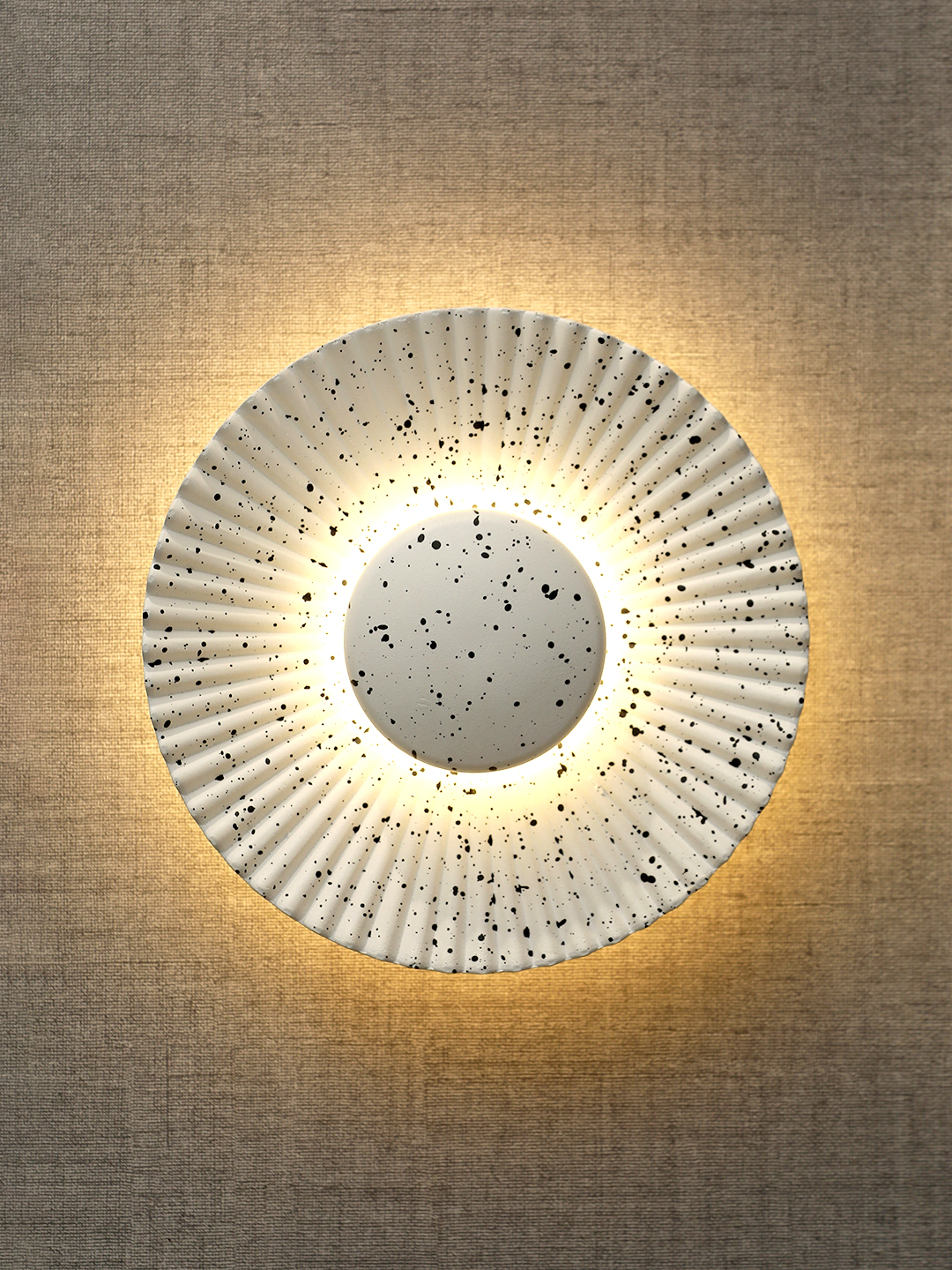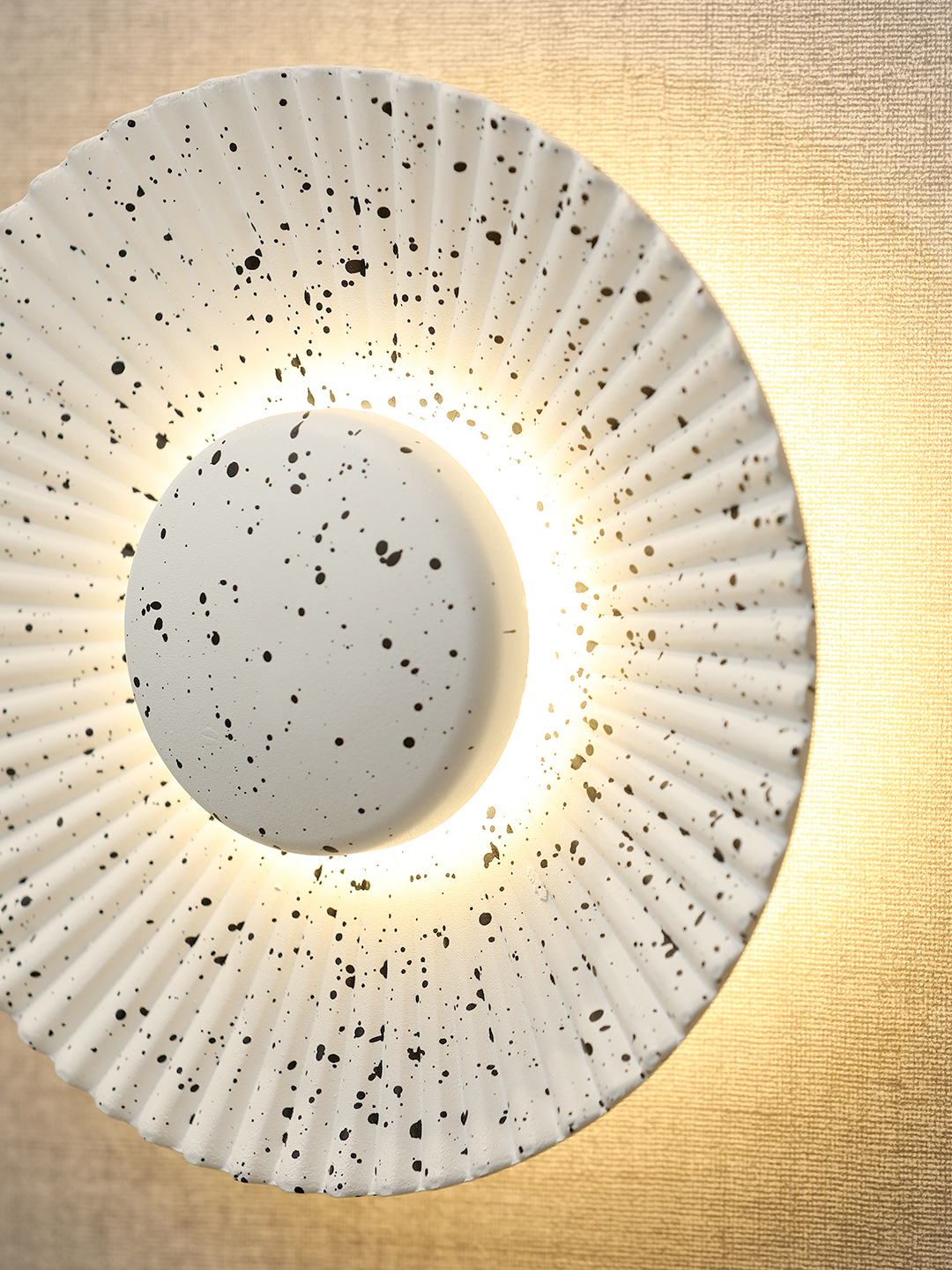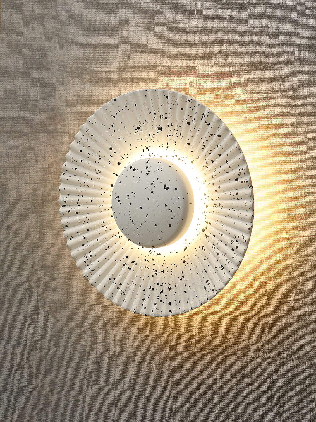Add a soft artistic touch to your walls with the Pebble Bloom Wall Light. Designed with a beautifully textured, ripple-style surface and a subtle speckled pattern, this light brings a calm, modern look to your space. Its circular shape spreads a gentle glow, making it ideal for creating a relaxed and welcoming atmosphere. The clean white finish blends effortlessly with modern, minimal, and contemporary interiors. Whether placed in living areas, corridors, or beside the bed, this wall light works as both a lighting feature and a decorative accent. Simple, stylish, and soothing it’s perfect for homes that value elegant design with warm lighting.