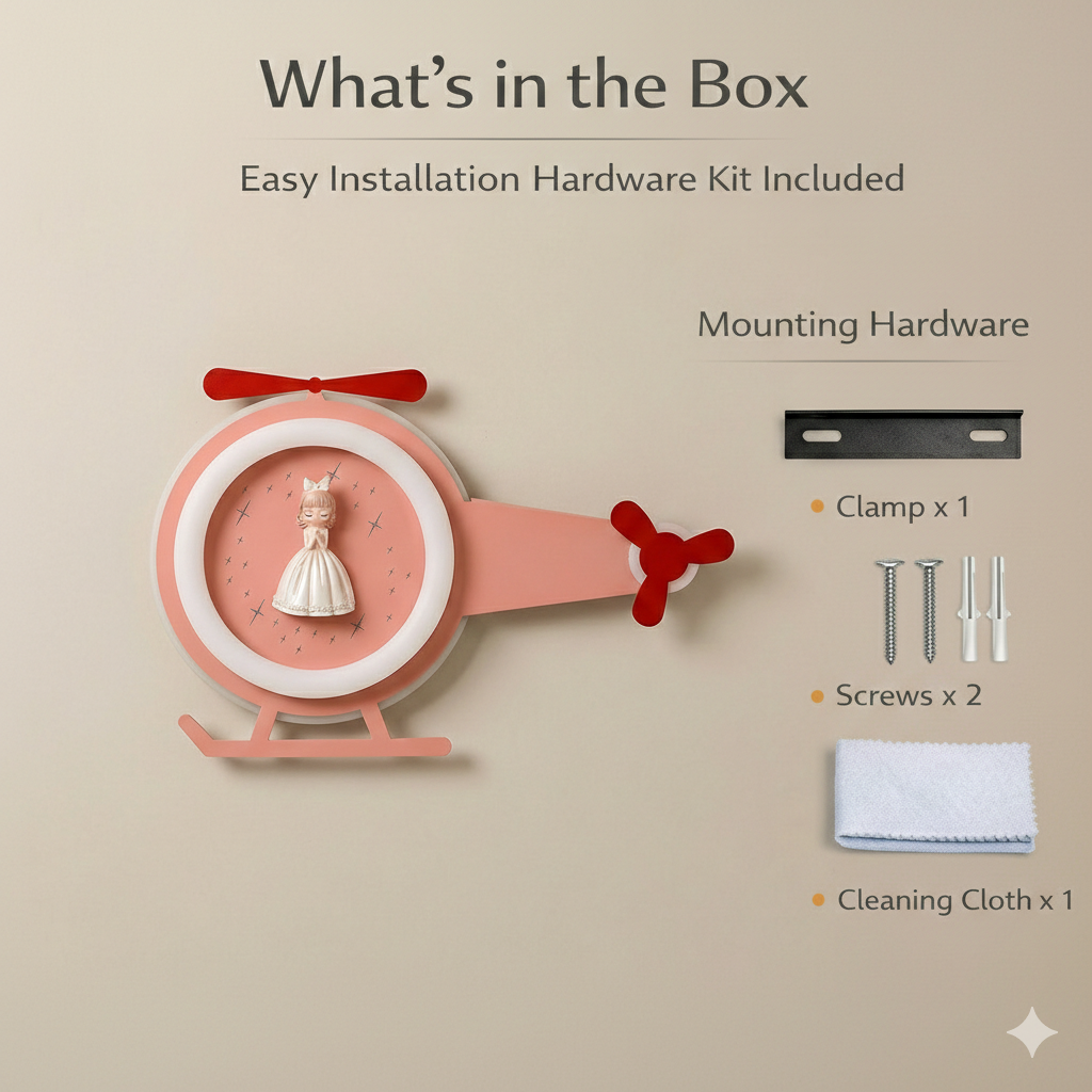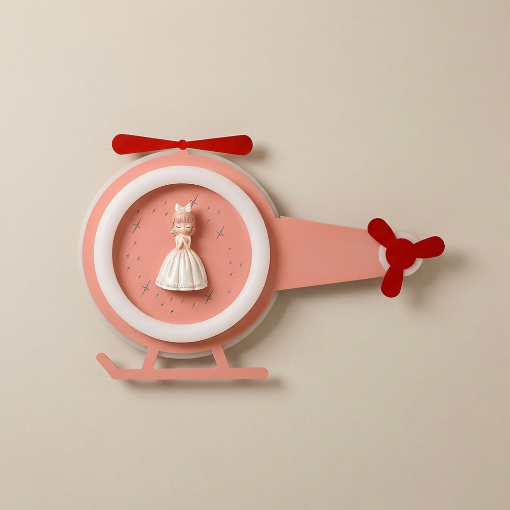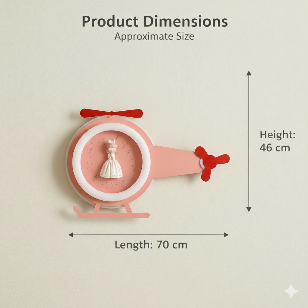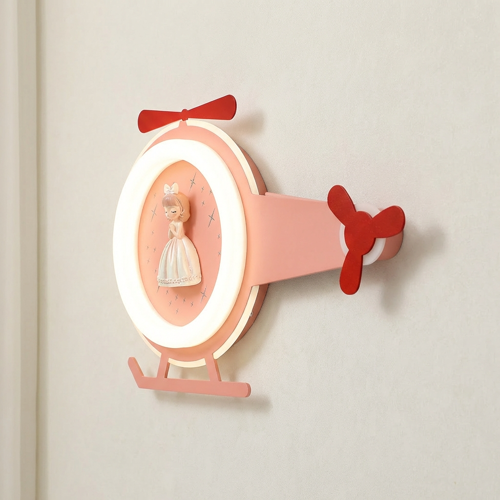 Add a touch of magic and imagination to kids? interiors with the Princess Copter Glow Wall Light. Designed in a charming helicopter shape with a sweet princess figurine at the center, this decorative wall lamp creates a soft, comforting glow that kids love. The playful propeller-style elements are purely decorative, enhancing the design without any moving parts. Crafted to complement modern kids decor themes, this wall light works beautifully as an accent piece for bedtime lighting, storytelling corners, or themed interiors. The gentle illumination helps create a calming atmosphere while the adorable design sparks creativity and joy. Ideal as a thoughtful gift for birthdays, baby celebrations, or nursery decor upgrades, this wall light blends visual charm with functional lighting in a delightful way.