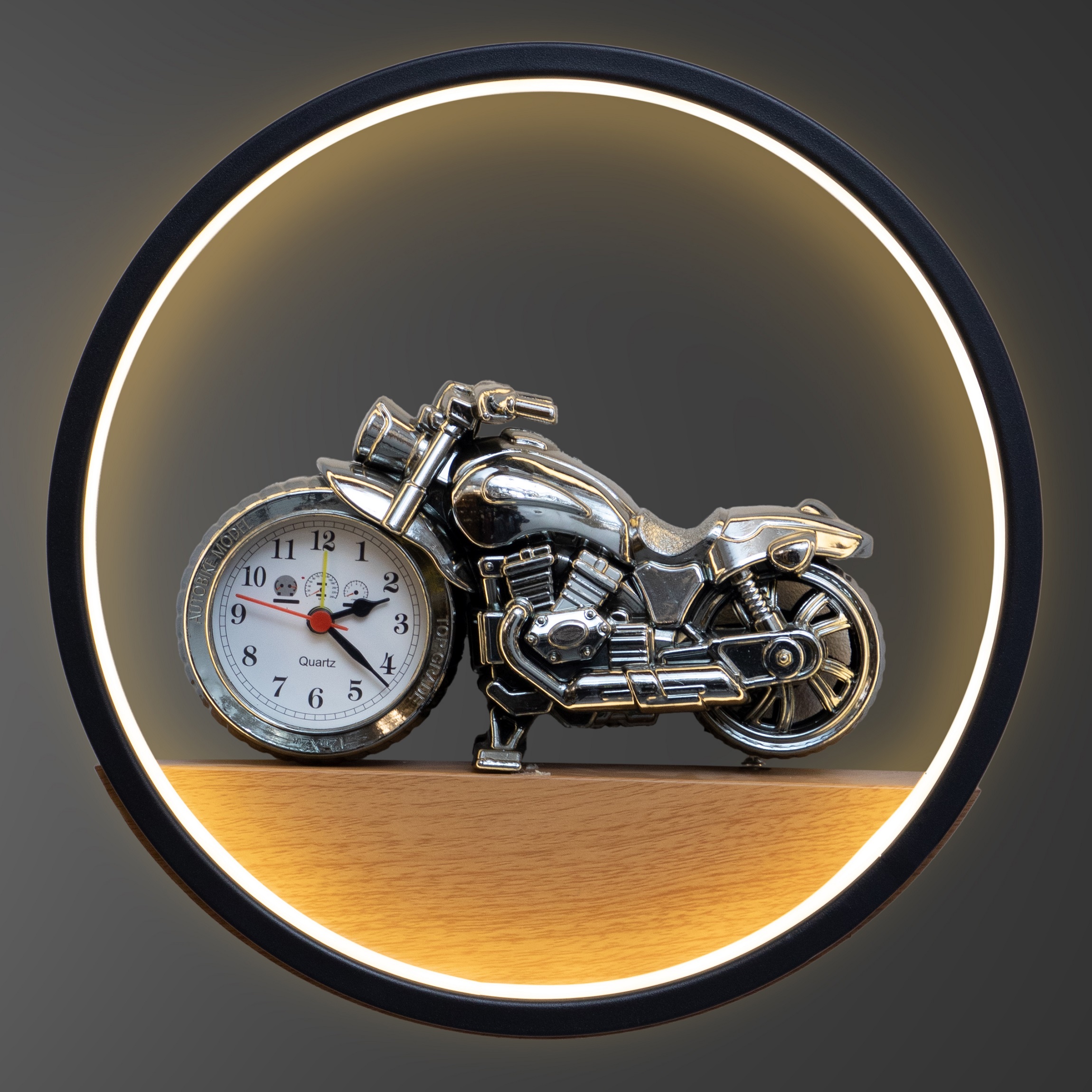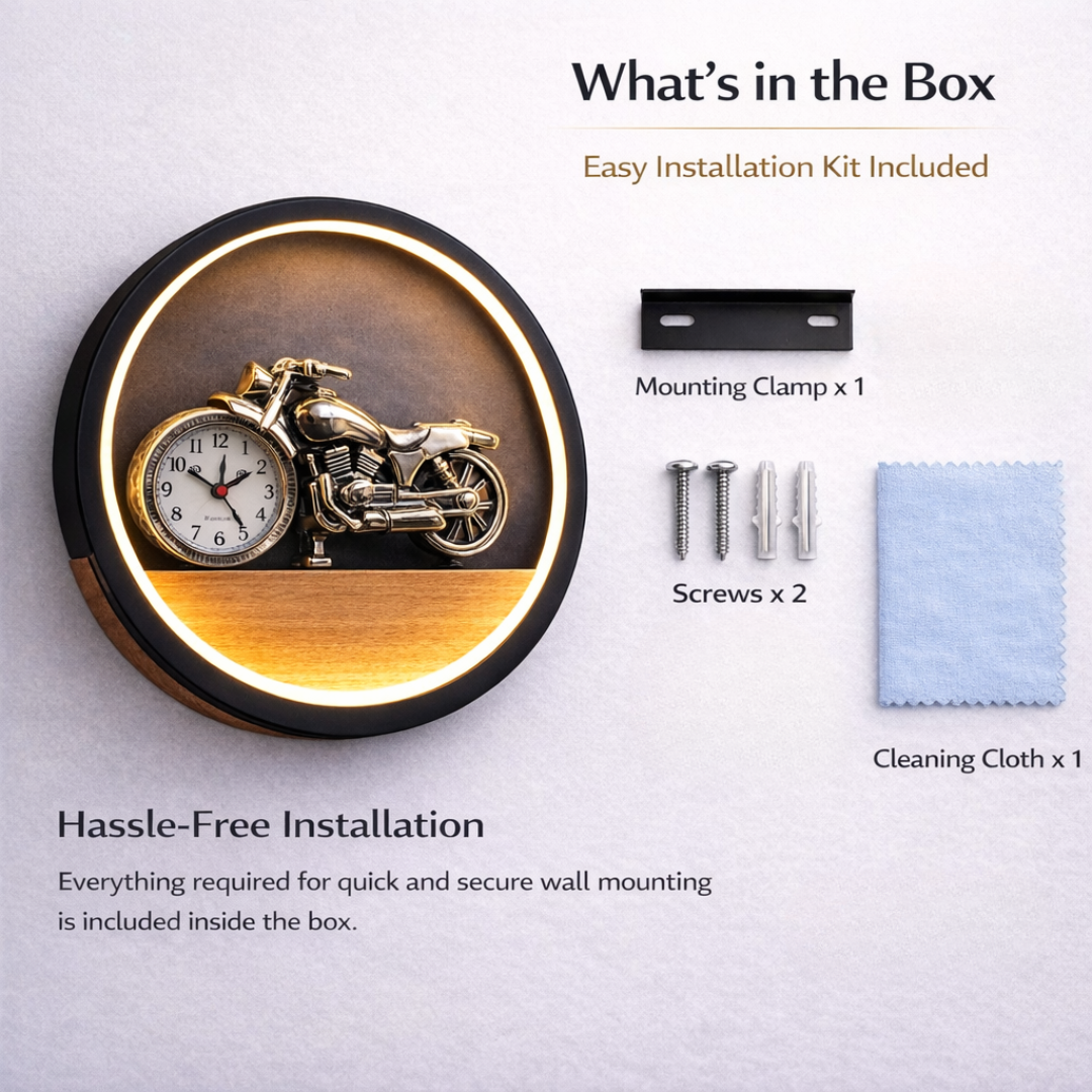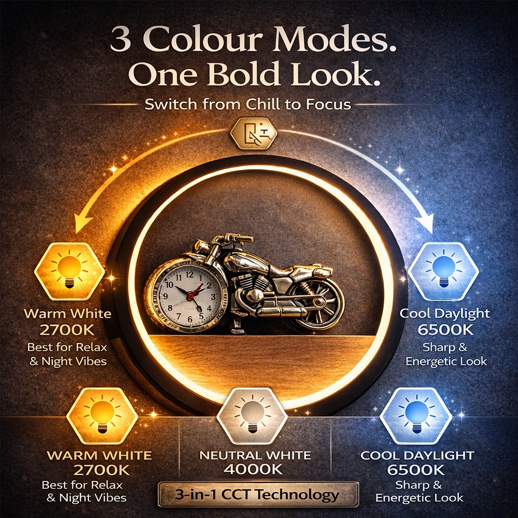 Make time-telling fun and exciting with the Rider Time Glow Kids Light Clock. Designed with a stylish motorcycle figure and built-in clock, this unique wall light is perfect for kids who love bikes, speed, and adventure. The soft LED glow creates a comfortable ambience for bedtime or night use, while the clear, easy-to-read clock helps kids learn time in a fun way. The circular frame with a wooden accent adds a modern touch, making it both decorative and functional. Ideal for kid’s bedrooms, study rooms, or play areas, this light-clock combo adds personality to the room while keeping it practical for everyday use.