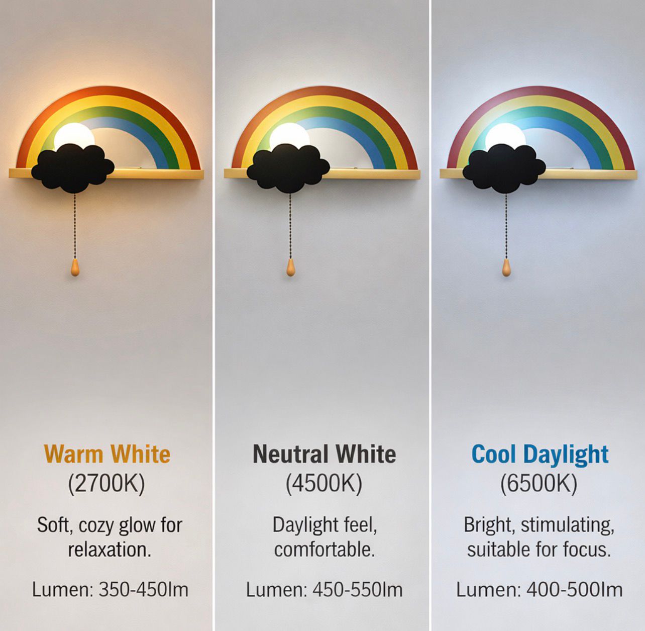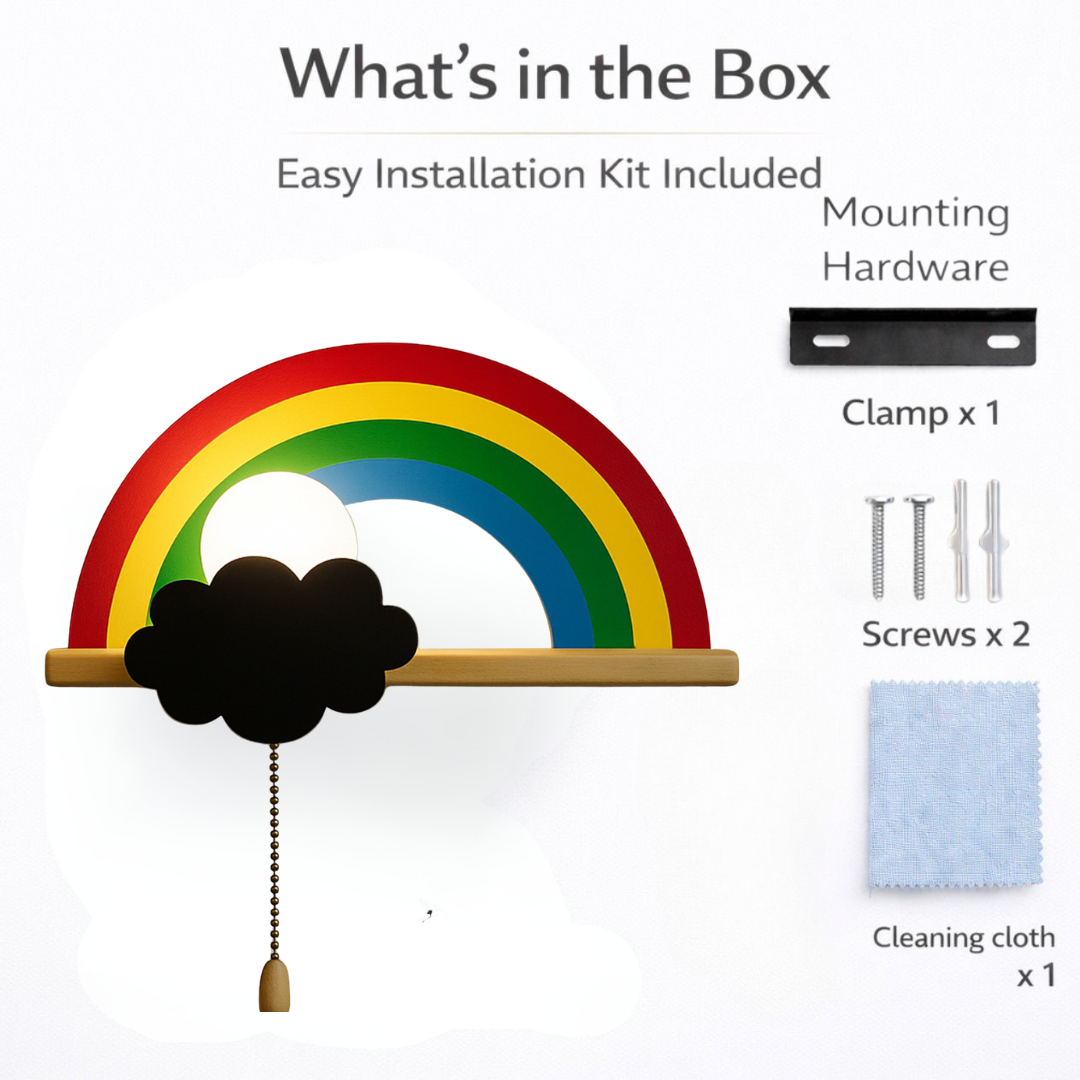 Bring joy and color to your child’s room with the Rainbow Dream Pull-Chain Wall Light. Designed with a bright rainbow, fluffy cloud, and soft glowing light, this wall lamp creates a happy and comforting atmosphere that kids will love. The easy pull-chain switch makes it fun and simple for children to turn the light on and off by themselves. It gives a soft, soothing glow, perfect for bedtime, night-time comfort, or gentle room lighting. Ideal for kids bedrooms, nurseries, playrooms, and study corners, this rainbow wall light adds a playful touch while also serving as a practical night lamp.