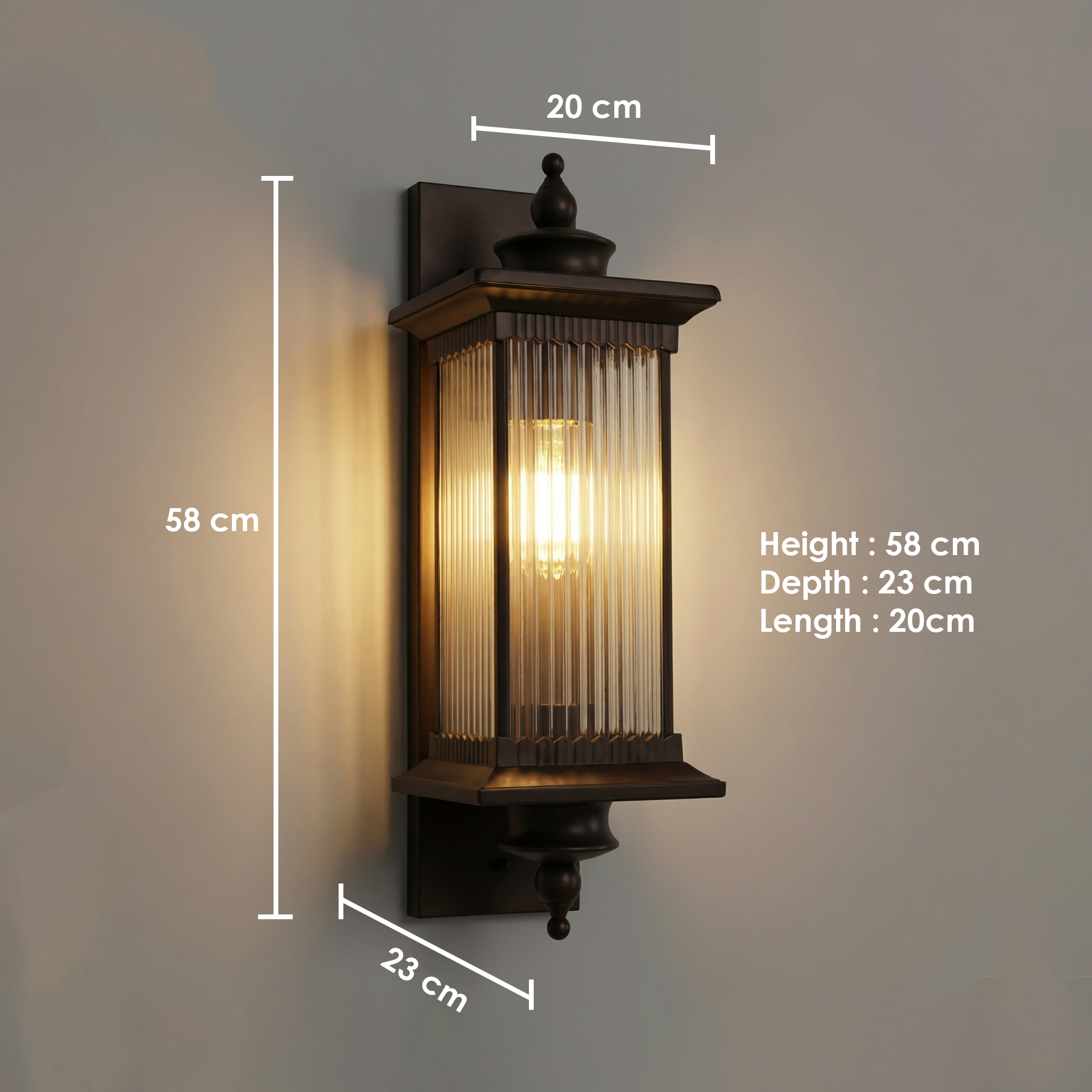 Enhance your exterior décor with the Proudome RegalFlute Outdoor Wall Light, a stylish lighting fixture designed to bring elegance and character to your walls. Featuring a beautifully crafted ribbed glass shade and a vintage-inspired metal frame, this wall lamp adds a refined architectural touch to both modern and traditional spaces.