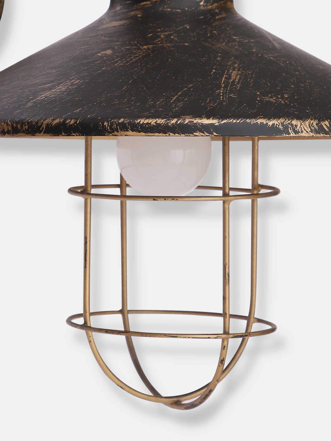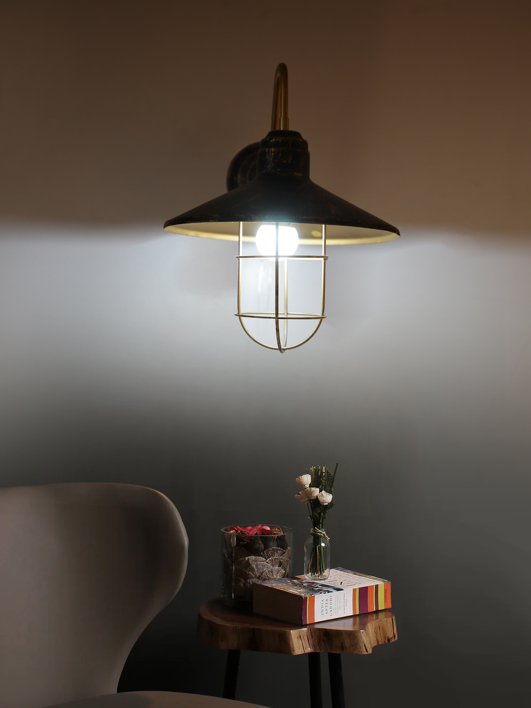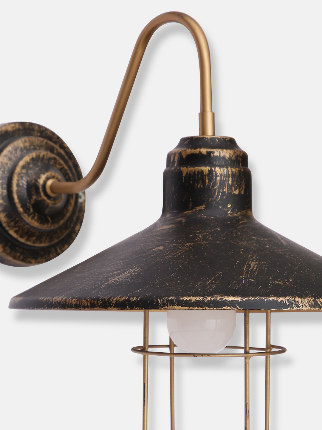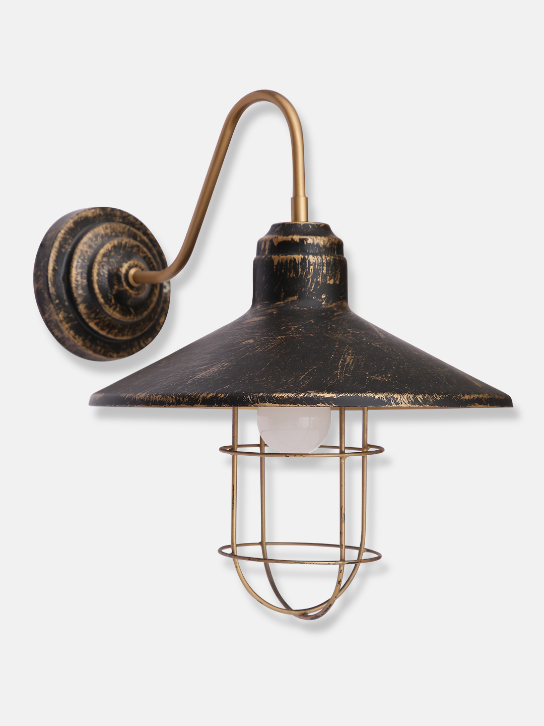 The RusticForge Outdoor Wall Light brings timeless charm with its vintage industrial design and distressed black-gold finish. Featuring a wide metal shade and protective cage, it provides warm, focused illumination ideal for entrances, patios, garden pathways, and exterior walls. Built with durable materials for reliable outdoor performance, this stylish lantern adds character and classic elegance to any outdoor setting.
