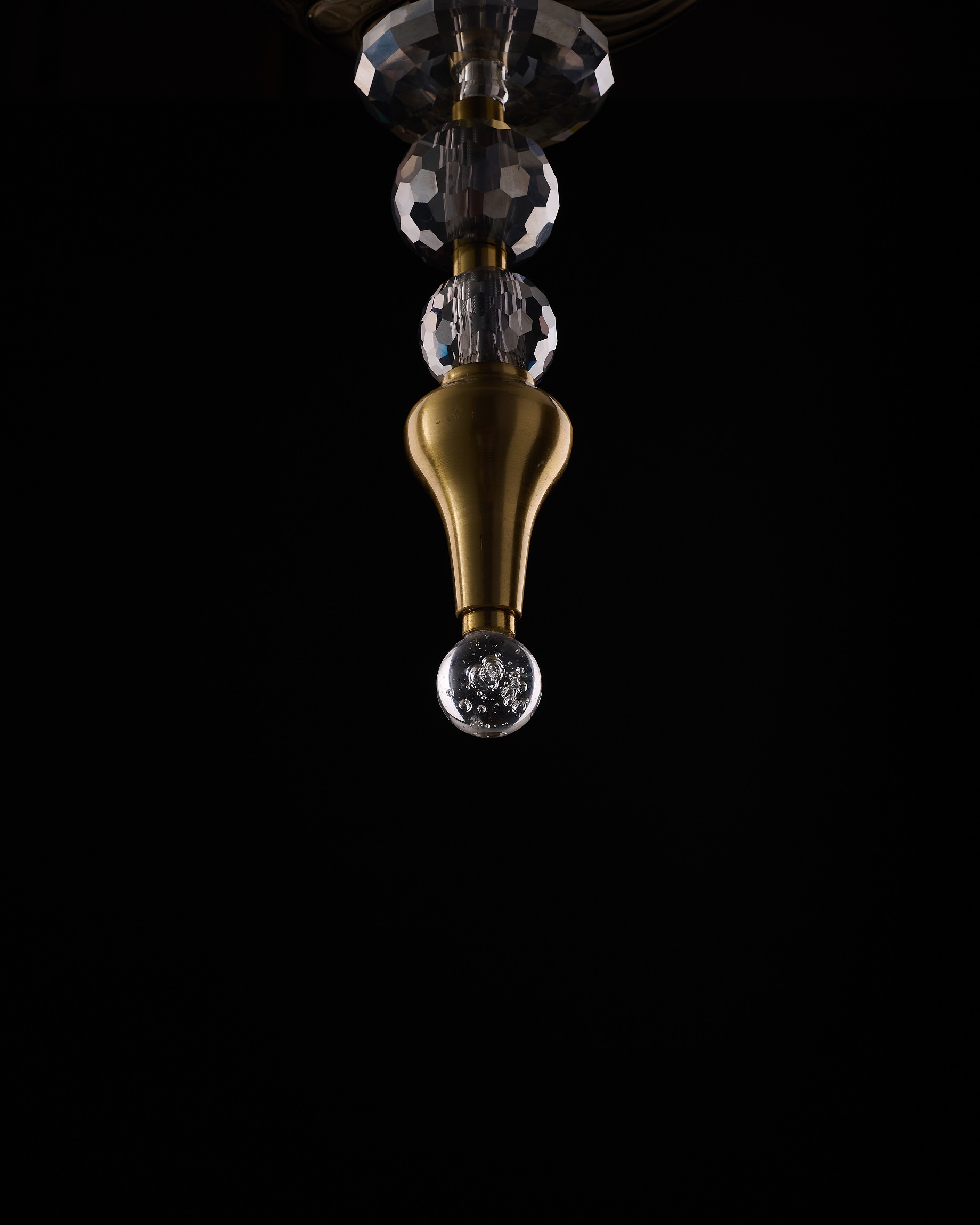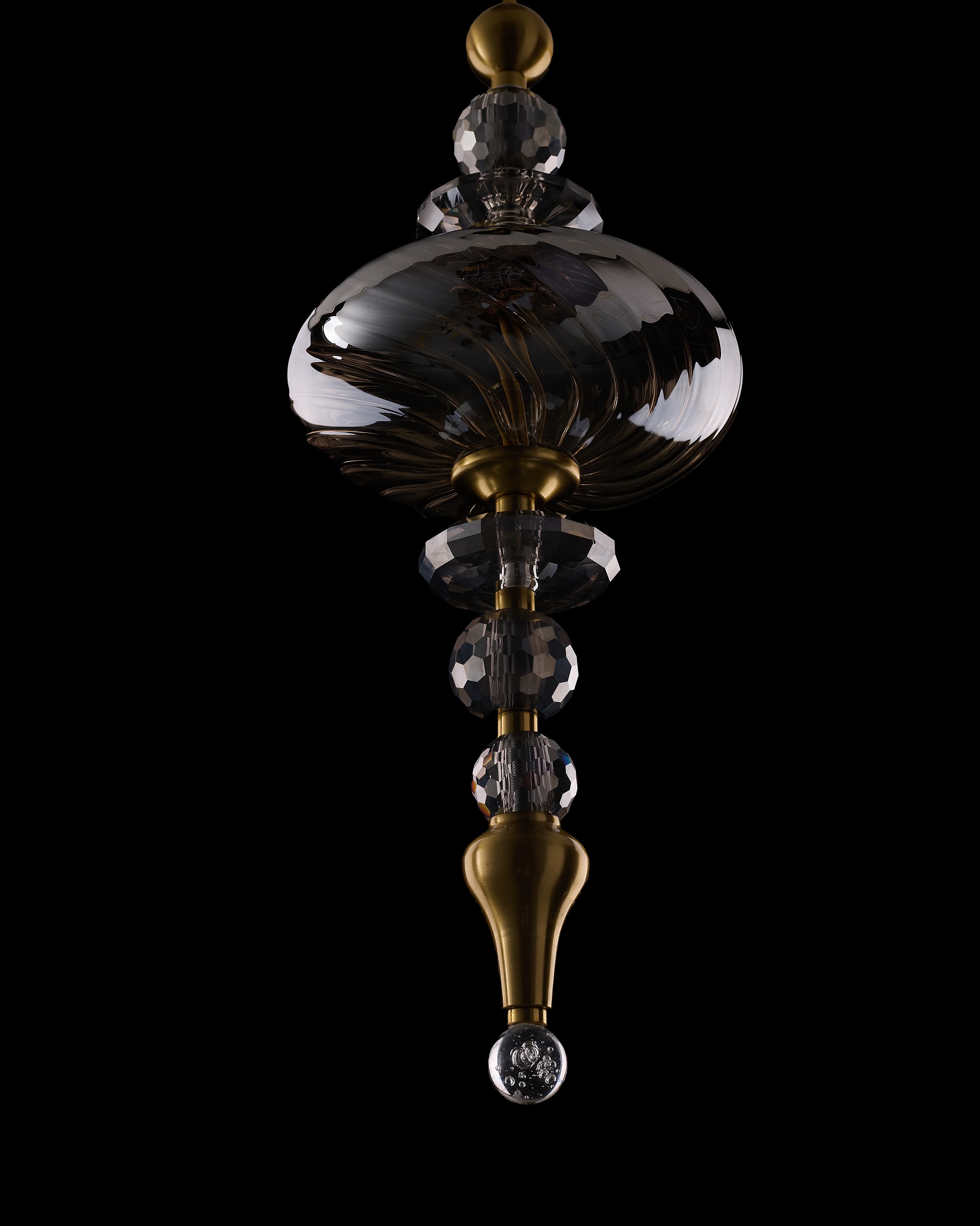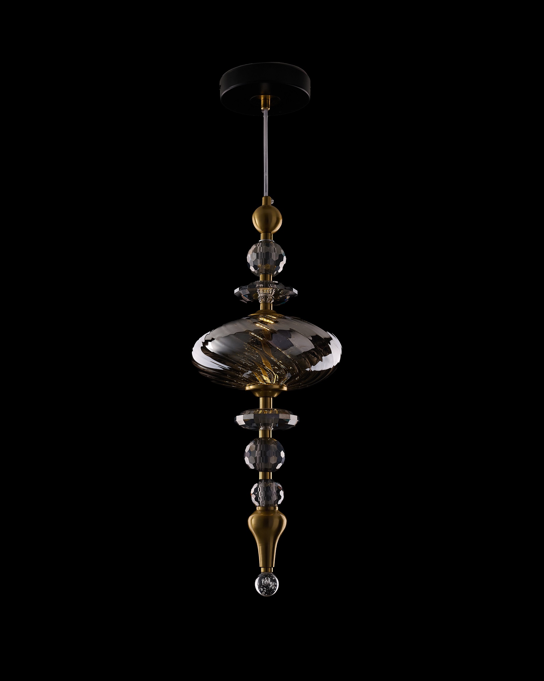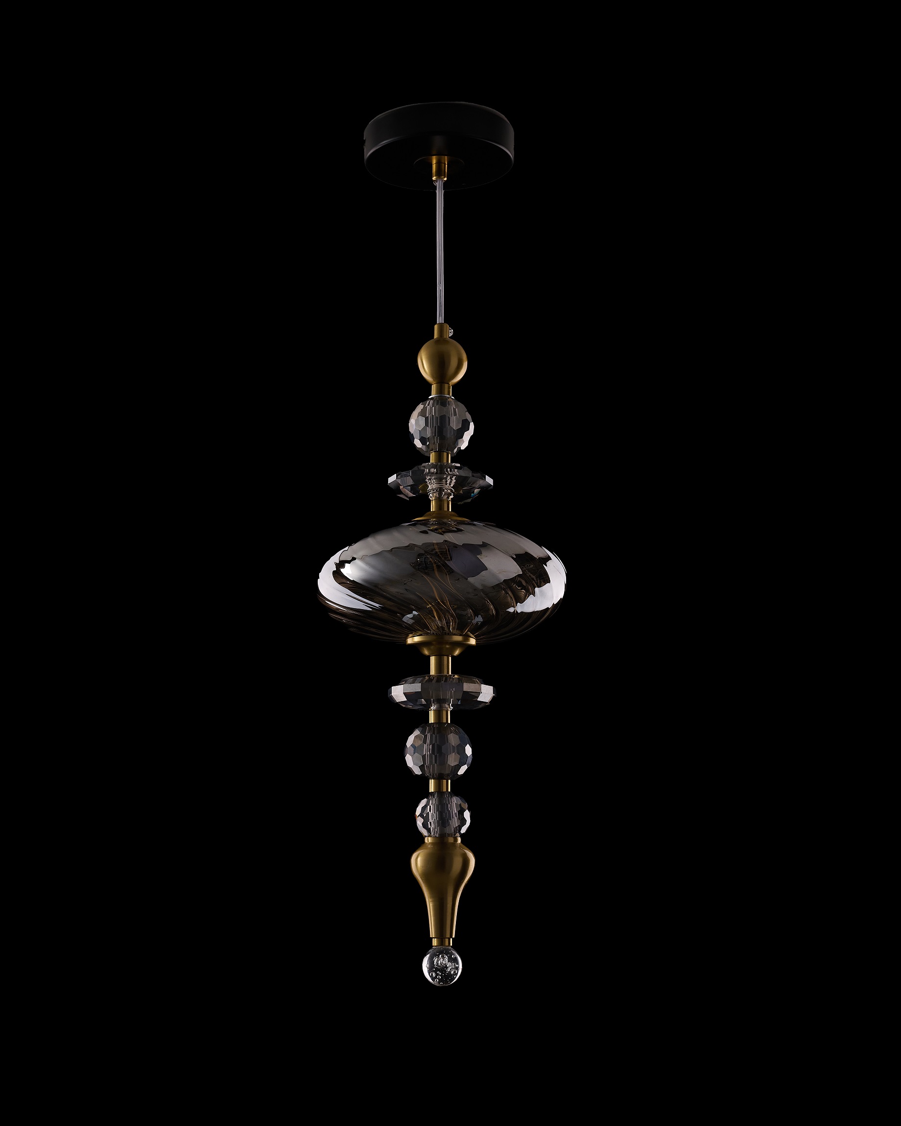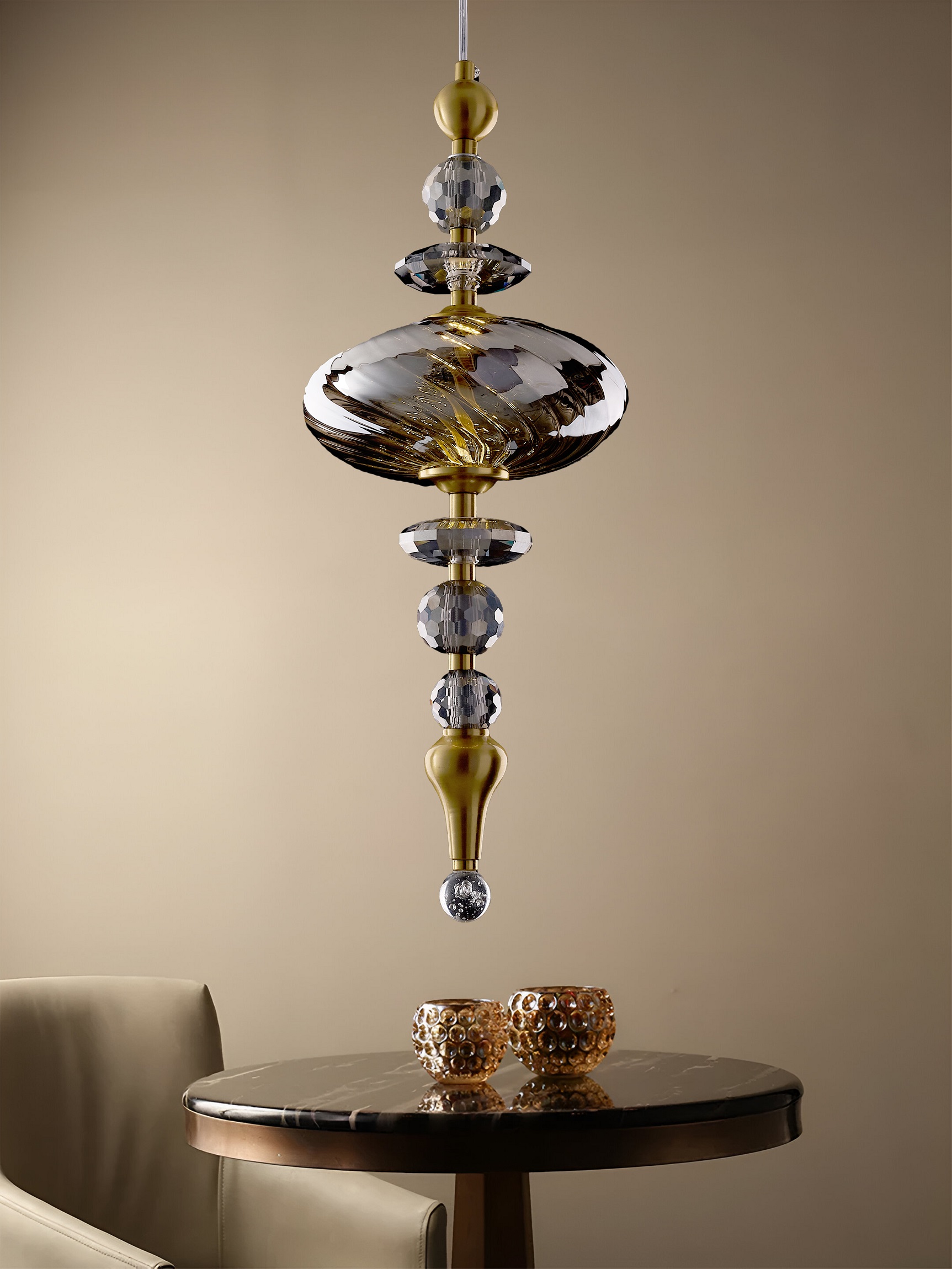 This smokey glass pendant light features a beautifully shaped glass form complemented by sparkling crystal elements and rich gold accents. The tinted glass creates a soft, ambient glow while the crystal details reflect light for added elegance. Designed with an adjustable hanging, it allows flexible height placement to suit different interiors. Stylish and sophisticated, this pendant serves as a striking focal light for modern and luxury decor.