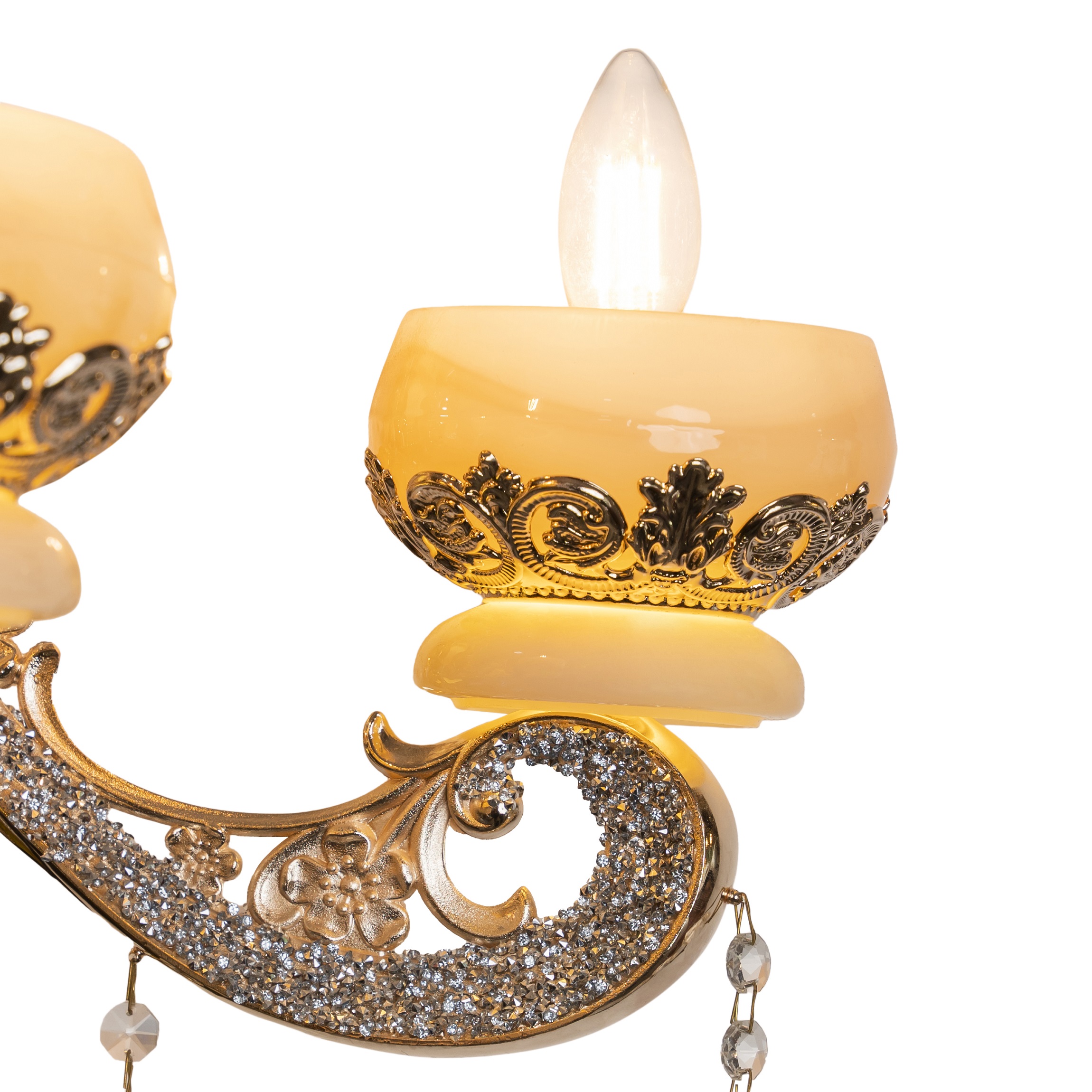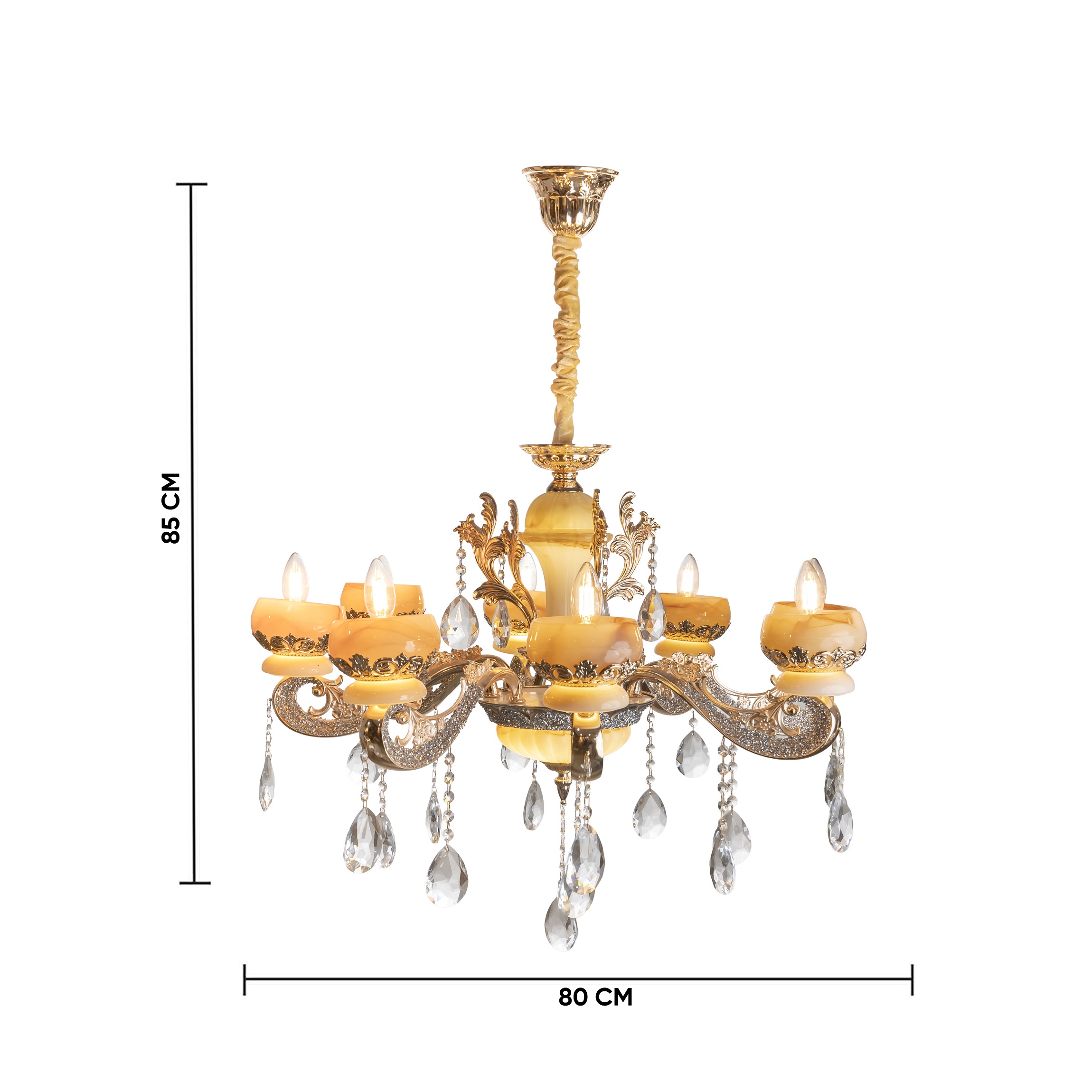 This Chandelier brings modern luxury into your living space with its fluid gold frame, soft amber glass cups, and precision-cut crystal drops. Designed to enhance warm tones and create a sophisticated ambiance, this chandelier is ideal for premium modern homes. Its sculpted arms and refined detailing make it a standout centerpiece for living rooms, dining areas, and lounge spaces.